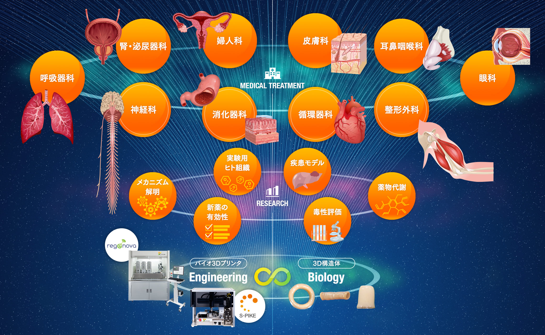 このバイオ3Dプリンタで作製した100%細胞のみで作製された組織・臓器「3D細胞製品」は、実際の組織・臓器に近い厚みと弾力性をもち、生体に近い機能を出すことができ、また外科的な処置を行うことも可能です。現在の先端医療においては、いまだ細胞のみから作製された立体的な再生医療等製品は存在していません。サイフューズの3D細胞製品のような新しい選択肢が誕生することにより、新たなマーケット創出に貢献することになります。